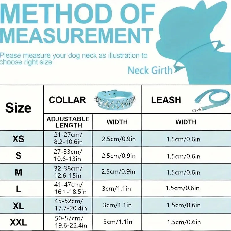 The spiked rivet design not only adds a bold, fashionable look but also offers extra protection for your pet’s neck. Paired with a sturdy matching leash, this set ensures durability, security, and a confident walking experience.
